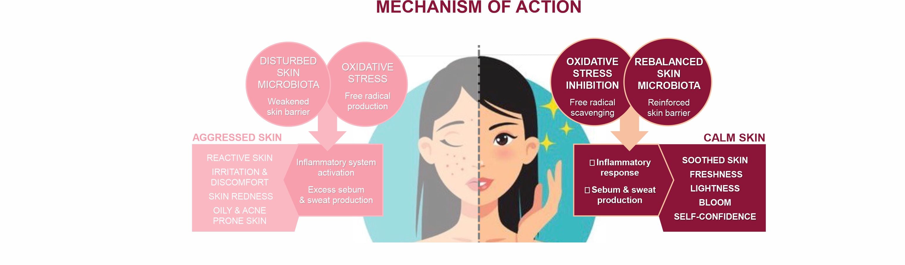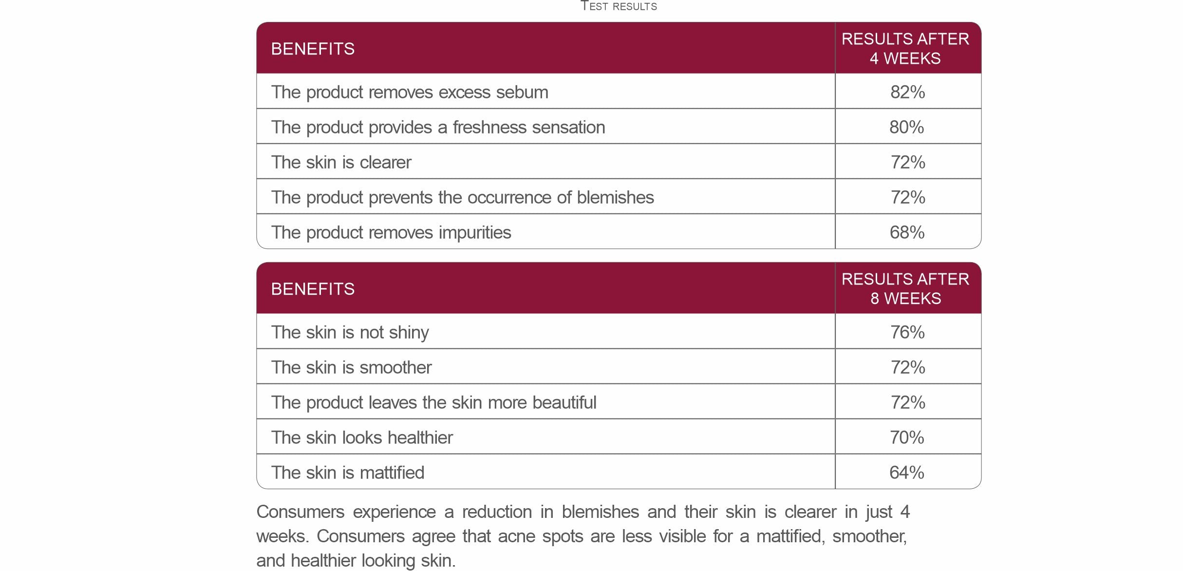 It Increases skin firmness, smoothness and hydration even under stressed conditions. Reduces signs of blemished skin (sebum, comedones, inflammatory lesions). Significant reduction of sebum production on scalp without impairing the barrier function of the scalp Benefits. Firms and smoothens the skin. Reduces imperfections and prevents breakouts. Balances sebum production on the skin. Ensures a clear and refined skin complexion