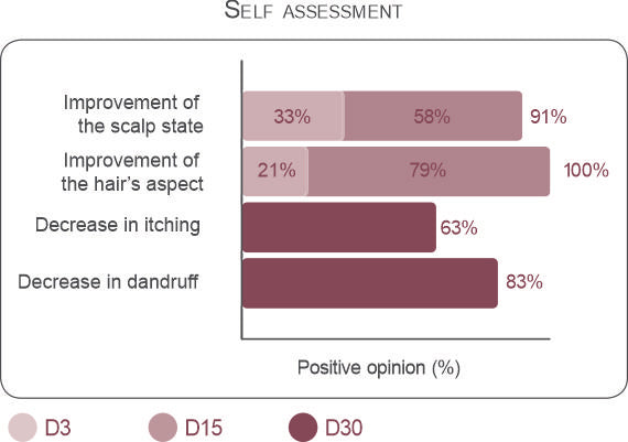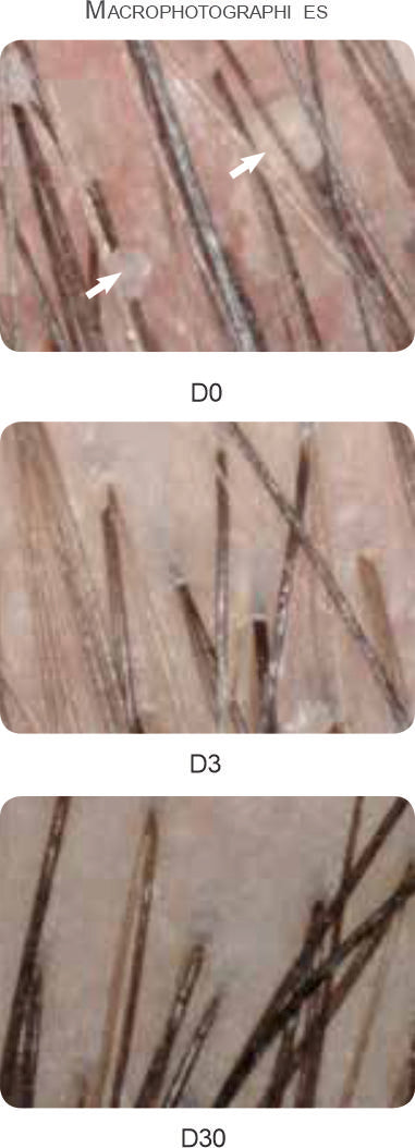 The regulation of sebum production leads to a significant decrease in sebum rate on the scalp at D15 (-58%) and D3 (-67%). 96% volunteers had an improvement.